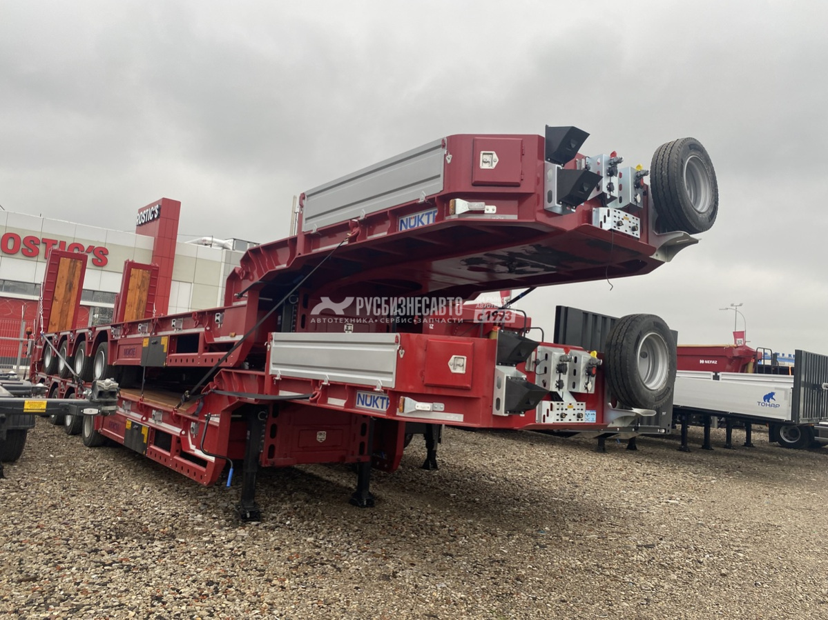 Низкорамный трал NUKTE NKT407 не раздвижной, 4 х 12 тонн Osman koc/4 х 14 Relax, пневмоподвеска с барабанными тормозами, длина платформы погрузочная 10 500 мм, 1-я ось подъемная, 4-ая подруливающяя, г/п 57 500 кг, собственная масса 12 500 кг, ширина 2.550 мм (выдвижные уширители платформы с двух сторон + 250 мм),  собственная гидростанция с работой от АКБ тягача. Под высоту ССУ тягача 1350 мм